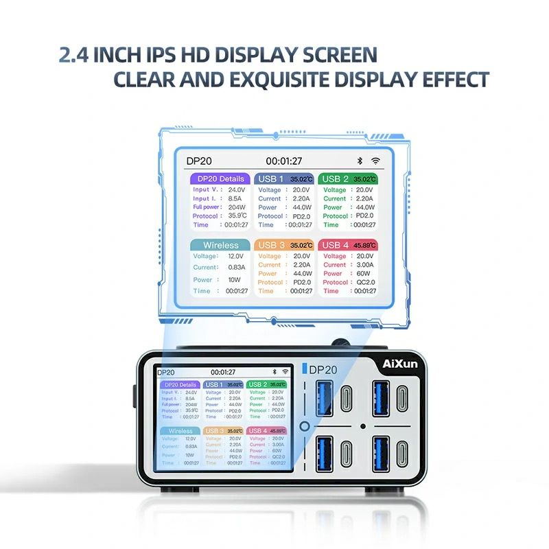 Главная Оборудование Зарядные устройства и тестеры Многопортовые ЗУ Зарядная станция AiXun DP20